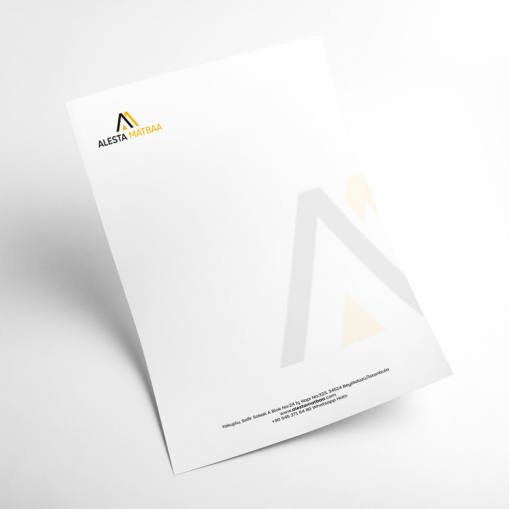 Her yazışmada firmanızı temsil eden, profesyonelliği ilk bakışta hissettiren tasarımlar: Kurumsal logo, iletişim bilgileri ve özgün çizgilerle hazırlanmış antetli kâğıtlar Alesta Matbaa farkıyla!